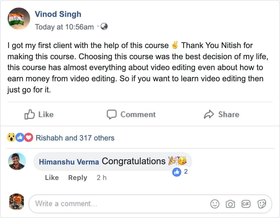 "Everything is covered for video editing in a structured format, even about how to get your first clients. Amazing Course! " - Pallavi D.